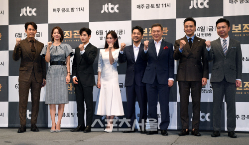 13ÀÏ ¼¿ï °³²±¸ ÀÓÇǸ®¾óÆÓ¸®½ºÈ£ÅÚ¿¡¼ ÁøÇàµÈ JTBC ±ÝÅäµå¶ó¸¶ ¡®º¸Á°ü¡¯ Á¦ÀÛ¹ßǥȸ¿¡¼ Ã⿬ ¹è¿ìµéÀÌ ÃëÀçÁøÀ» ÇâÇØ Æ÷Á ÃëÇϰí ÀÖ´Ù. ¿ÞÂʺÎÅÍ ÀÌÁ¤Àç, ½Å¹Î¾Æ, ±èµ¿ÁØ, ÀÌ¿¤¸®¾ß,  Á¤Áø¿µ, ±è°©¼ö, Á¤¿õÀÎ, ÀÓ¿øÈñ.