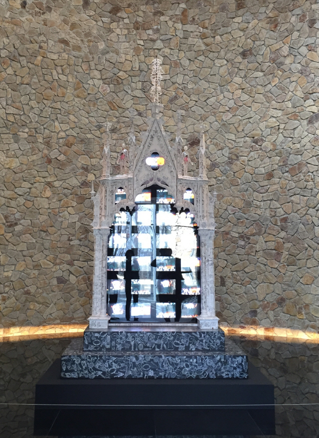 ÇöÀç ¹ÂÁö¾ö»êÀÇ ¹é³²Áذü¿¡´Â 1993³âÀÛ ¡®1936 µ¥¼ÒÅä(DESOTO)¡¯¸¦ ¸¸³¯ ¼ö ÀÖ´Ù. /»çÁøÁ¦°ø=¹ÂÁö¾ö»ê ¹ÂÁö¾ö»êÀº Á¤±âÀûÀ¸·Î ¹é³²ÁذüÀÇ ÀÛǰÀ» ¹Ù²ã°¡¸ç °ø°³Çß´Ù. 2015³â¿¡´Â 1992³âÀÛ ¡®À§¼º³ª¹«¡¯¸¦ ¼±º¸¿´´Ù. ³ôÀ̰¡ 326§¯ÀÇ, ¸» ±×´ë·Î ³ª¹« ¸ð¾çÀÌ´Ù. »ç°¢ÇüÀÇ TV°¡ ½×¿© ³ª¹« µÕÄ¡¸¦ ÀÌ·ç°í µÕ±Ù ³ª¹«¿¡ À§¼ºÀ» »ó¡ÇÏ´Â TV°¡ ¿¸Åó·³ ´Þ·ÁÀÖ´Ù. ±â°è¿Í »ý¸í, °úÇаú Á¾±³, Âû³ª¿Í ¿µ¿ø °°Àº ÀÌÁúÀûÀÎ °ÍµéÀÌ °øÁ¸ÇÏ´Â ÀÛǰÀÌ´Ù. ºñµð¿À ¿µ»óÀÌ µ¹¾Æ°¡´Ï ³ª¹«°¡ »ý¸í·ÂÀ» °®°í ²ÞƲ´ë´Â °Íó·³ º¸ÀδÙ. ÀÌ °í¹®Àº ±â¼úÀÌ ¹Ù²ã°¥ ¹Ì·¡¸¦ °Á¶ÇØ ³²¾çÁֽà ¸¶¼®ÀÇ ÇѼÖÁ¦Áö ±â¼ú¿ø º¹µµ¿¡ ¿¬±¸¿øµéÀÌ º¼ ¼ö ÀÖ°Ô²û ¡®À§¼º³ª¹«¡¯¸¦ ¼³Ä¡Çϱ⵵ Çß´Ù. ¿¹¼ú°ú °úÇÐÀÌ °¡Áø ¡®Ã¢Á¶¡¯¶ó´Â °øÅëÁ¡À» °Á¶ÇÑ °ÍÀ̾ú´Ù.
